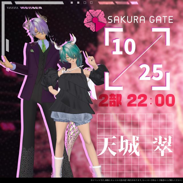 入場チケットをお持ちの方は10/25(土) 2部 22:00~(キャスト:天城翠)「SAKURA GATE」ワールドへ入場することができます。 【販売期間:2025年10月14日(火)19:00~2025年10月22日(水)23:59まで】 ※ご購入前に必ず下記の注意事項等をよくお読みください。 ※予定枚数に達し次第、販売終了いたします。 開催日:2025年10月25日(土) 時間: 2部 22:00~ (キャスト:天城翠) 会場:Babell (https://gugenka.inc/babell) 参加方法:イベント会場に入場する方法は、イベント当日にメールにてご案内いたします。 ※@gugenka.jpからのメールを受け取れるよう設定してください 「SAKURA GATE」X:https://x.com/Sakuragate_VRC【本商品内容】