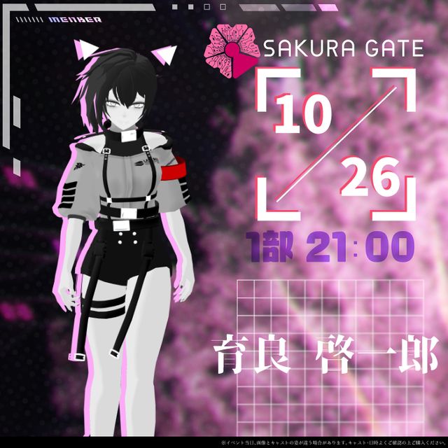 入場チケットをお持ちの方は10/26(日) 1部 21:00~(キャスト:育良啓一郎)「SAKURA GATE」ワールドへ入場することができます。 【販売期間:2025年10月15日(水)19:00~2025年10月22日(水)23:59まで】 ※ご購入前に必ず下記の注意事項等をよくお読みください。 ※予定枚数に達し次第、販売終了いたします。 開催日:2025年10月26日(日) 時間: 1部 21:00~ (キャスト:育良啓一郎) 会場:Babell (https://gugenka.inc/babell) 参加方法:イベント会場に入場する方法は、イベント当日にメールにてご案内いたします。 ※@gugenka.jpからのメールを受け取れるよう設定してください 「SAKURA GATE」X:https://x.com/Sakuragate_VRC【本商品内容】
