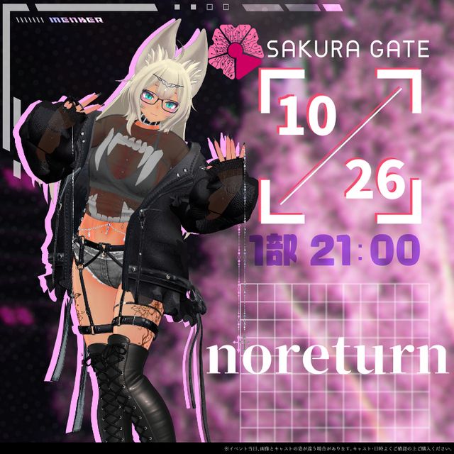 入場チケットをお持ちの方は10/26(日) 1部 21:00~(キャスト:noreturn)「SAKURA GATE」ワールドへ入場することができます。 【販売期間:2025年10月15日(水)19:00~2025年10月22日(水)23:59まで】 ※ご購入前に必ず下記の注意事項等をよくお読みください。 ※予定枚数に達し次第、販売終了いたします。 開催日:2025年10月26日(日) 時間: 1部 21:00~ (キャスト:noreturn) 会場:Babell (https://gugenka.inc/babell) 参加方法:イベント会場に入場する方法は、イベント当日にメールにてご案内いたします。 ※@gugenka.jpからのメールを受け取れるよう設定してください 「SAKURA GATE」X:https://x.com/Sakuragate_VRC【本商品内容】
