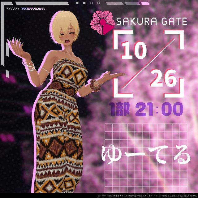 入場チケットをお持ちの方は10/26(日) 1部 21:00~(キャスト:ゆーてる)「SAKURA GATE」ワールドへ入場することができます。 【販売期間:2025年10月15日(水)19:00~2025年10月22日(水)23:59まで】 ※ご購入前に必ず下記の注意事項等をよくお読みください。 ※予定枚数に達し次第、販売終了いたします。 開催日:2025年10月26日(日) 時間: 1部 21:00~ (キャスト:ゆーてる) 会場:Babell (https://gugenka.inc/babell) 参加方法:イベント会場に入場する方法は、イベント当日にメールにてご案内いたします。 ※@gugenka.jpからのメールを受け取れるよう設定してください 「SAKURA GATE」X:https://x.com/Sakuragate_VRC【本商品内容】