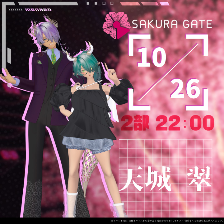 入場チケットをお持ちの方は10/26(日)2部 22:00~(キャスト:天城翠)「SAKURA GATE」ワールドへ入場することができます。 【販売期間:2025年10月15日(水)19:00~2025年10月22日(水)23:59まで】 ※ご購入前に必ず下記の注意事項等をよくお読みください。 ※予定枚数に達し次第、販売終了いたします。 開催日:2025年10月26日(日) 時間:2部 22:00~ (キャスト:天城翠) 会場:Babell (https://gugenka.inc/babell) 参加方法:イベント会場に入場する方法は、イベント当日にメールにてご案内いたします。 ※@gugenka.jpからのメールを受け取れるよう設定してください 「SAKURA GATE」X:https://x.com/Sakuragate_VRC【本商品内容】