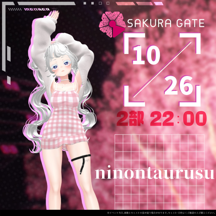 入場チケットをお持ちの方は10/26(日)2部 22:00~(キャスト:ninontaurusu)「SAKURA GATE」ワールドへ入場することができます。 【販売期間:2025年10月15日(水)19:00~2025年10月22日(水)23:59まで】 ※ご購入前に必ず下記の注意事項等をよくお読みください。 ※予定枚数に達し次第、販売終了いたします。 開催日:2025年10月26日(日) 時間:2部 22:00~ (キャスト:ninontaurusu) 会場:Babell (https://gugenka.inc/babell) 参加方法:イベント会場に入場する方法は、イベント当日にメールにてご案内いたします。 ※@gugenka.jpからのメールを受け取れるよう設定してください 「SAKURA GATE」X:https://x.com/Sakuragate_VRC【本商品内容】