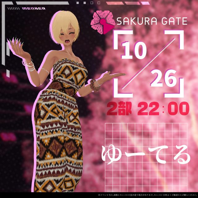 入場チケットをお持ちの方は10/26(日)2部 22:00~(キャスト:ゆーてる)「SAKURA GATE」ワールドへ入場することができます。 【販売期間:2025年10月15日(水)19:00~2025年10月22日(水)23:59まで】 ※ご購入前に必ず下記の注意事項等をよくお読みください。 ※予定枚数に達し次第、販売終了いたします。 開催日:2025年10月26日(日) 時間:2部 22:00~ (キャスト:ゆーてる) 会場:Babell (https://gugenka.inc/babell) 参加方法:イベント会場に入場する方法は、イベント当日にメールにてご案内いたします。 ※@gugenka.jpからのメールを受け取れるよう設定してください 「SAKURA GATE」X:https://x.com/Sakuragate_VRC【本商品内容】