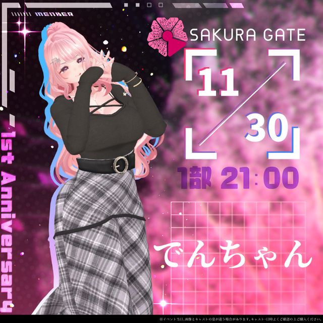入場チケットをお持ちの方は11/30(日) 1部 21:00~(キャスト:でんちゃん)「SAKURA GATE」ワールドへ入場することができます。 【販売期間:2025年11月18日(火)19:00~2025年11月26日(水)23:59まで】 ※ご購入前に必ず下記の注意事項等をよくお読みください。 ※予定枚数に達し次第、販売終了いたします。 開催日:2025年11月30日(日) 時間: 1部 21:00~ (キャスト:でんちゃん) 会場:Babell (https://gugenka.inc/babell) 参加方法:イベント会場に入場する方法は、イベント当日にメールにてご案内いたします。 ※@gugenka.jpからのメールを受け取れるよう設定してください 「SAKURA GATE」X:https://x.com/Sakuragate_VRC【本商品内容】