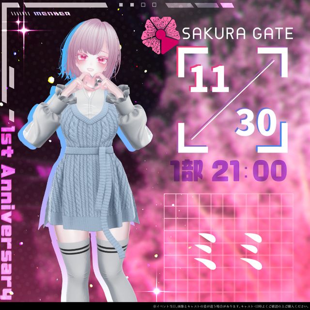 入場チケットをお持ちの方は11/30(日) 1部 21:00~(キャスト:ミミ)「SAKURA GATE」ワールドへ入場することができます。 【販売期間:2025年11月18日(火)19:00~2025年11月26日(水)23:59まで】 ※ご購入前に必ず下記の注意事項等をよくお読みください。 ※予定枚数に達し次第、販売終了いたします。 開催日:2025年11月30日(日) 時間: 1部 21:00~ (キャスト:ミミ) 会場:Babell (https://gugenka.inc/babell) 参加方法:イベント会場に入場する方法は、イベント当日にメールにてご案内いたします。 ※@gugenka.jpからのメールを受け取れるよう設定してください 「SAKURA GATE」X:https://x.com/Sakuragate_VRC【本商品内容】