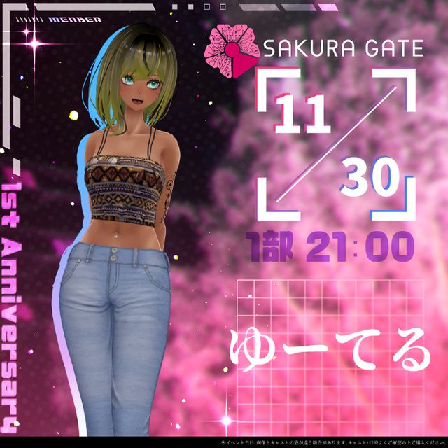 入場チケットをお持ちの方は11/30(日) 1部 21:00~(キャスト:ゆーてる)「SAKURA GATE」ワールドへ入場することができます。 【販売期間:2025年11月18日(火)19:00~2025年11月26日(水)23:59まで】 ※ご購入前に必ず下記の注意事項等をよくお読みください。 ※予定枚数に達し次第、販売終了いたします。 開催日:2025年11月30日(日) 時間: 1部 21:00~ (キャスト:ゆーてる) 会場:Babell (https://gugenka.inc/babell) 参加方法:イベント会場に入場する方法は、イベント当日にメールにてご案内いたします。 ※@gugenka.jpからのメールを受け取れるよう設定してください 「SAKURA GATE」X:https://x.com/Sakuragate_VRC【本商品内容】