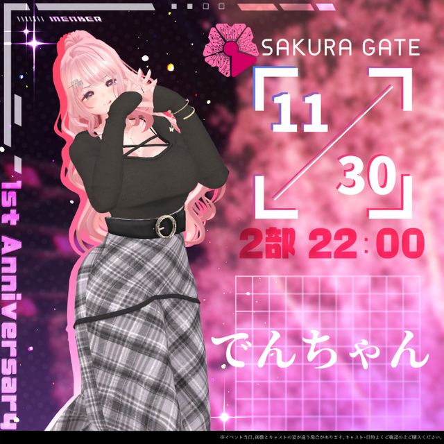 入場チケットをお持ちの方は11/30(日) 2部 22:00~(キャスト:でんちゃん)「SAKURA GATE」ワールドへ入場することができます。 【販売期間:2025年11月18日(火)19:00~2025年11月26日(水)23:59まで】 ※ご購入前に必ず下記の注意事項等をよくお読みください。 ※予定枚数に達し次第、販売終了いたします。 開催日:2025年11月30日(日) 時間: 2部 22:00~ (キャスト:でんちゃん) 会場:Babell (https://gugenka.inc/babell) 参加方法:イベント会場に入場する方法は、イベント当日にメールにてご案内いたします。 ※@gugenka.jpからのメールを受け取れるよう設定してください 「SAKURA GATE」X:https://x.com/Sakuragate_VRC【本商品内容】