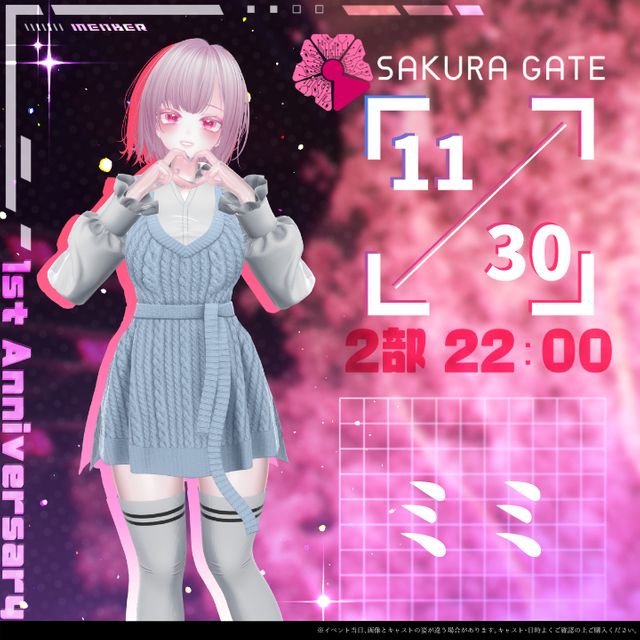 入場チケットをお持ちの方は11/30(日) 2部 22:00~(キャスト:ミミ)「SAKURA GATE」ワールドへ入場することができます。 【販売期間:2025年11月18日(火)19:00~2025年11月26日(水)23:59まで】 ※ご購入前に必ず下記の注意事項等をよくお読みください。 ※予定枚数に達し次第、販売終了いたします。 開催日:2025年11月30日(日) 時間: 2部 22:00~ (キャスト:ミミ) 会場:Babell (https://gugenka.inc/babell) 参加方法:イベント会場に入場する方法は、イベント当日にメールにてご案内いたします。 ※@gugenka.jpからのメールを受け取れるよう設定してください 「SAKURA GATE」X:https://x.com/Sakuragate_VRC【本商品内容】